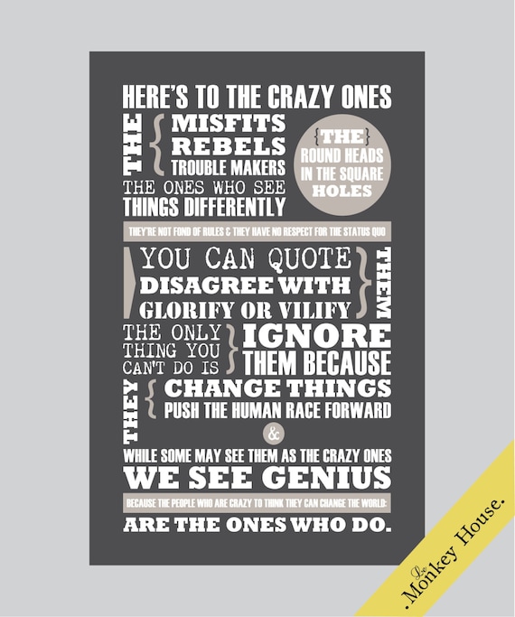 Unavailable Listing on Etsy from img1.etsystatic.com Because the people who are crazy enough to think they can change the world, are the ones who do. And he does it with passion. Here's what the commercial said: And they have no respect for the status quo. Here's to the crazy ones, the misfits, the rebels. Here's to the crazy ones, the misfits, the rebels, the troublemakers, the round pegs in the square holes… the ones who see things differently — they're not fond of rules… you can quote them, disagree with them, glorify or vilify them, but the only thing you can't do is ignore them because they change. The strength of 'here's to the crazy ones' is that while it is literally an advertisement for a company, the ad does not sell a specific product. Apparently steve felt that if he did it, people might misinterpret his intention and think he was talking about himself rather than the whole apple.